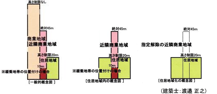 また、「商業地域若しくは、工業地域」と「住居系地域」との間に配置され、其々の緩衝地帯と成るべき地帯の筈です。当市には、「近隣商業地域」の「高さ指定」は「絶対45m」のみです。特に、両側「住居地域」の場合、如何にも、不均衝にて、不適切な状況です。状況に応じて、「30m・20m・15m」等ランク付けの見直しが必要です。住区に必要な商業施設の誘導配置は必要で重要です。住居地域の中に、商業施設が、混在させるべきでもありません。見直しに依り「近隣商業地域」を撤廃した方がよい所も多く存在致します。「住居地域」内にあっても、「住区に必要な商業施設」は、立地可能であり、「近隣商業地域」で在る必要はありません。